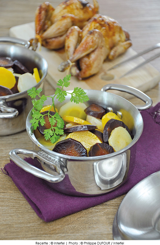 Cocotte de légumes anciens glacés au miel et cailles rôties