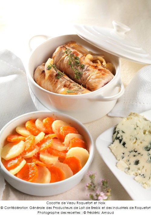 1• Pour la Cocotte de Veau : Préparez une farce avec un œuf battu, le Roquefort émietté et les noix concassées. Étalez cette farce sur les escalopes de veau.