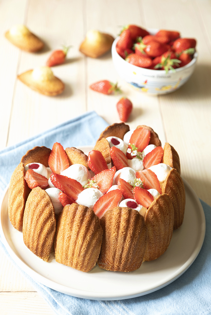 Un dessert raffiné aux notes vanillées, mêlant la douceur d’une crème onctueuse aux madeleines d’Armor pur beurre et la fraîcheur des gariguettes de Plougastel, relevé d’un délicat coulis de fraise.