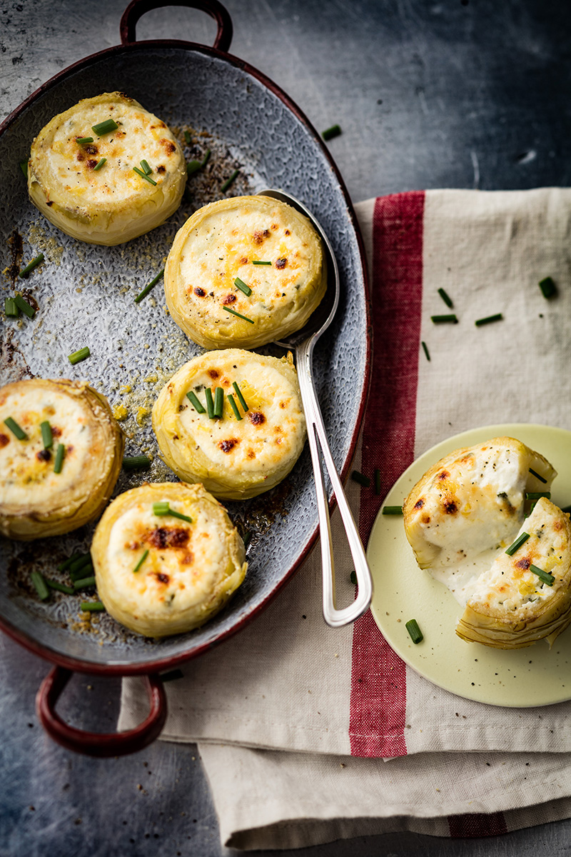 Des fonds d'artichaut garnis de crème et de parmesan puis gratinés au four.