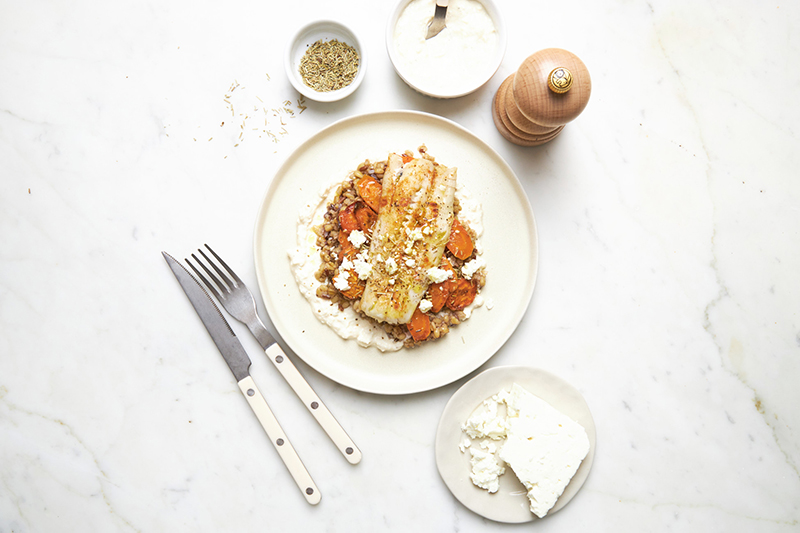 ⑦• Dans une assiette, étalez la crème de feta. Ajoutez le mélange de céréales sur le dessus, suivi des carottes rôties et du colin.