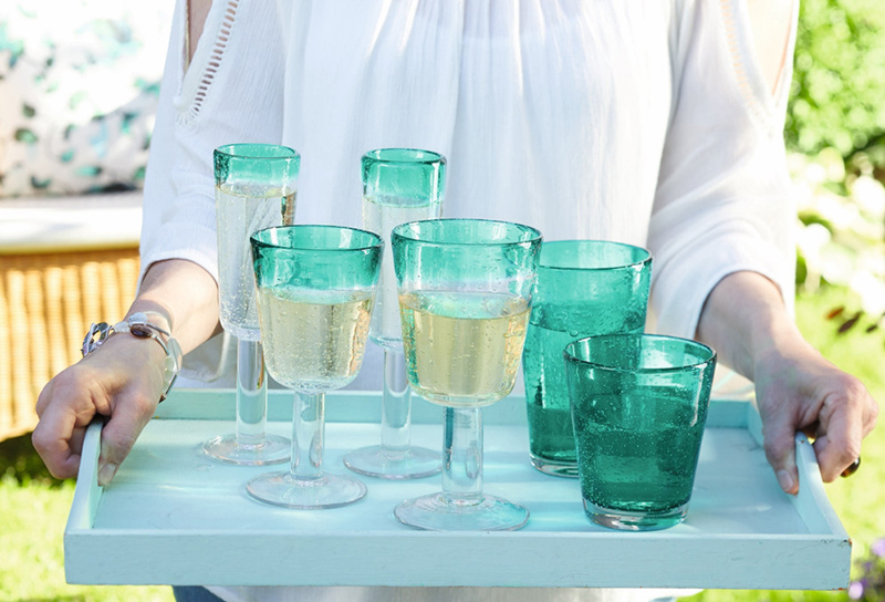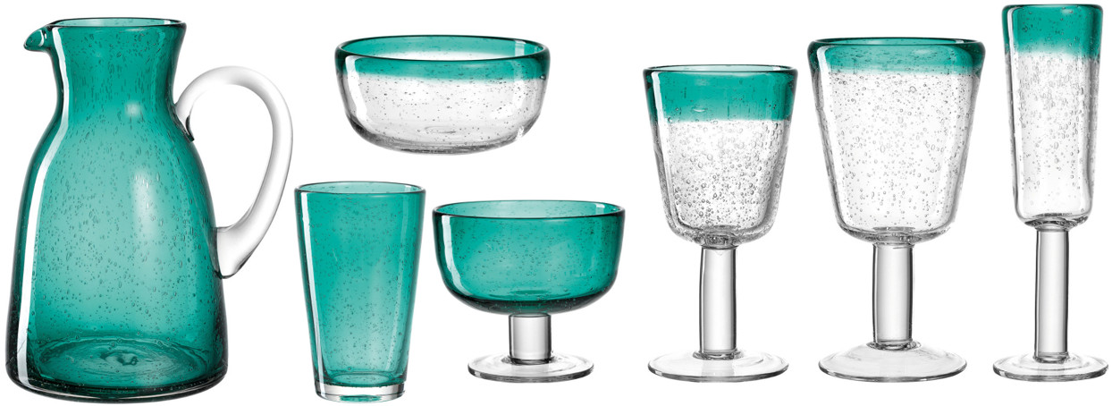 Faite main, cette série unique est à l’image des créations de l’île du nord de la lagune de Venise. Délicate, en verre bullé, d’un bleu translucide, qui révèle une exquise saveur artisanale.