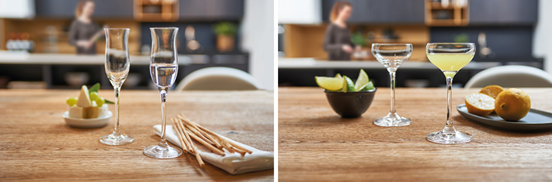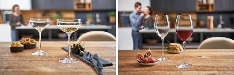 L'original petit déjeuner au mimosa est tout aussi apprécié que le dîner aux chandelles. Pour cela, il vous suffit de choisir de jolis verres adaptés à la situation pour créer une ambiance festive. Le champagne est joliment mis en valeur dans une flûte longiligne, tandis que le noble Bourgogne développe tous ses arômes dans un verre plus évasé.