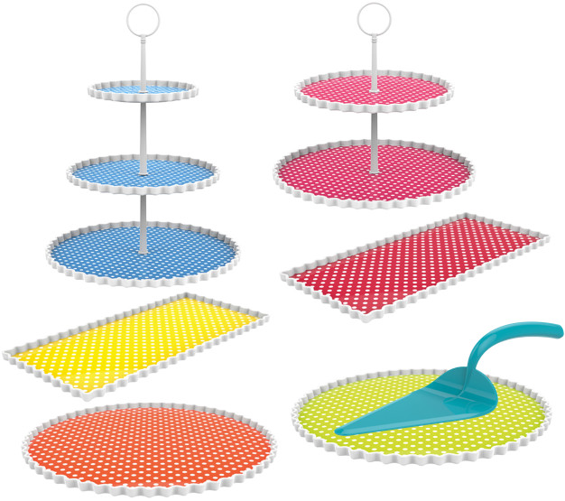 Collection de vaisselle en mélamine colorée autour de la pâtisserie