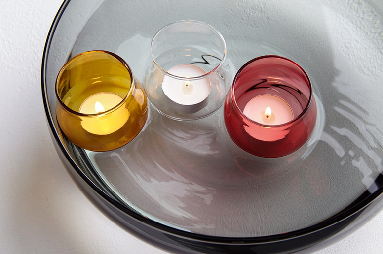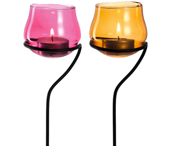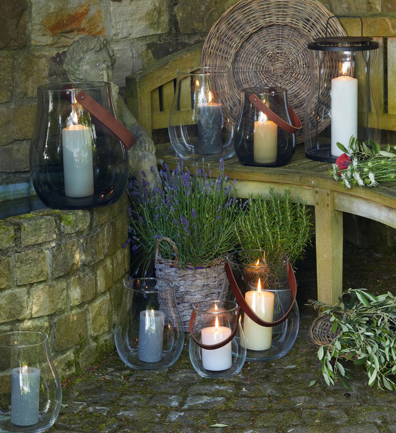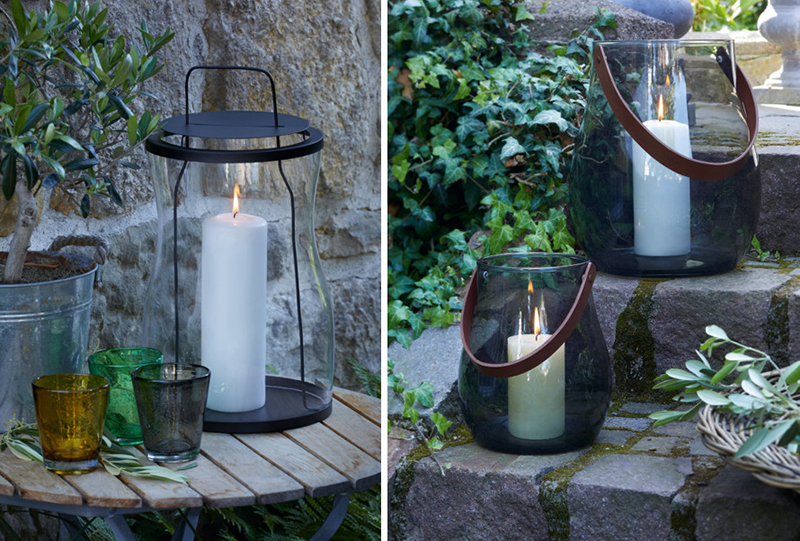 Giardino évoque la pureté et la lumière ; des lanternes et photophores en verre transparent ou grisé, associé à du métal noir design ou des poignées de cuir, et enfin des bougies colorées à faire flotter dans des coupelles en verre.