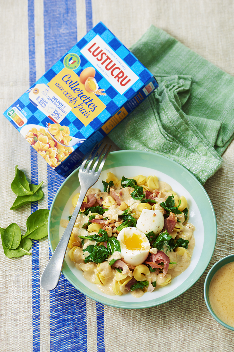 ⑧• Mélanger les pâtes cuites avec les épinards au Comté, laisser chauffer une minute. Server en assiette creuse avec un œuf fendu sur chaque assiette, le jaune doit être bien coulant.