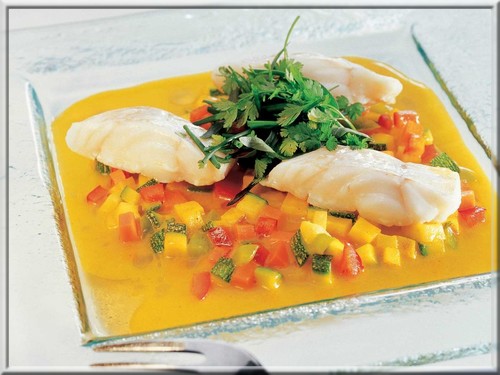 Sur assiettes chaudes, dresser harmonieusement les cubes de poisson, arroser de sauce et parsemer de petits légumes, accompagner de la vinaigrette d'orange et d'herbes.