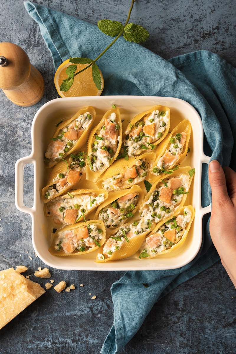 Conchiglionis farcis à la truite, ricotta, petits pois et citron
