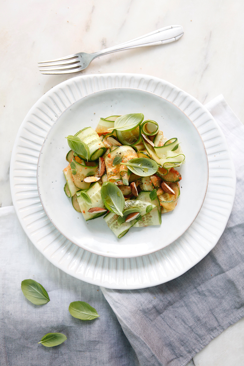Concombres de France en tagliatelles et pesto au piment, miel et amandes