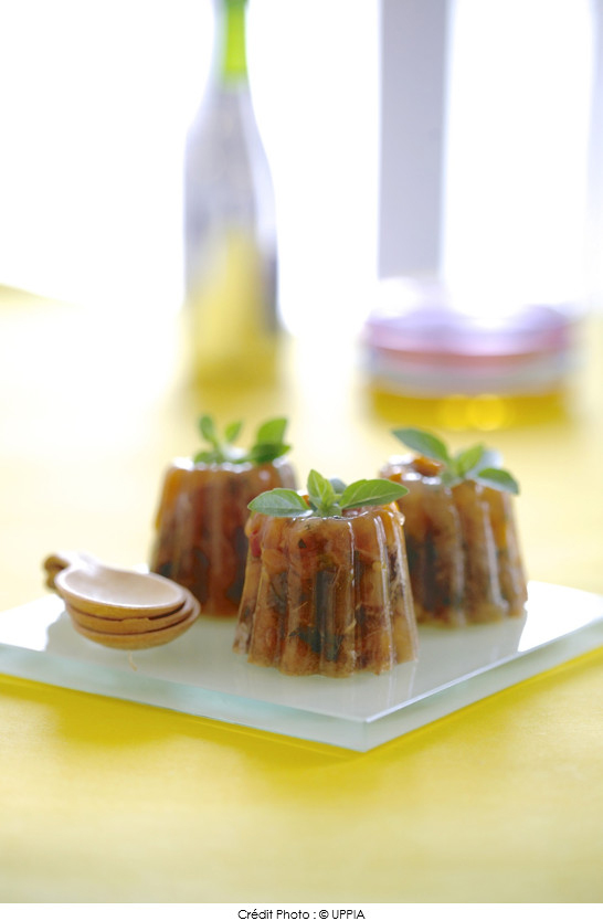 ③• Mélanger l’agar agar au bouillon, faire chauffer, incorporer petit à petit la gélatine au bouillon chaud, le verser sur la ratatouille, ajouter le canard effiloché et les carottes.