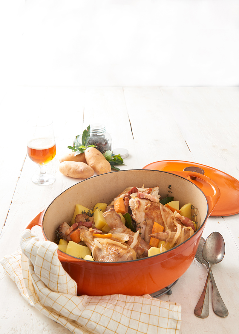 SERVEZ les morceaux de coq bien chauds nappés de sauce à la bière, avec les pommes de terre et les carottes.