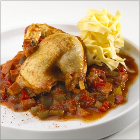 Disposer sur assiette, une moitié de coquelet à la basquaise accompagnée d'un nid de tagliatelles. Parsemer de piment d'Espelette.