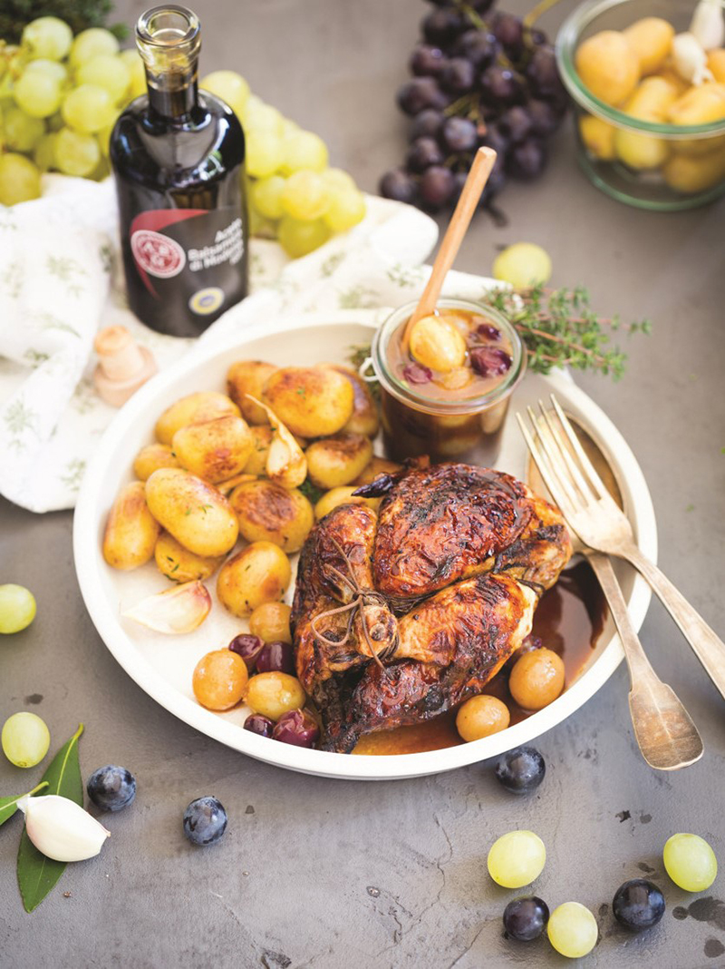 Coquelet rôti au Vinaigre Balsamique de Modène IGP, jus aux deux raisins