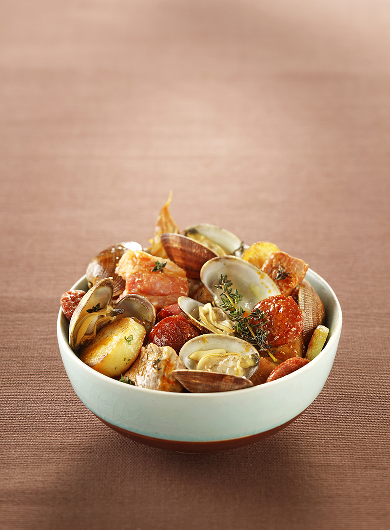 ④• Faire revenir les pommes de terre épluchées et en morceaux, dans une sauteuse et 1 cuillère d’huile. Ajouter l’eau de cuisson des coques et laisser cuire 10 minutes. Ajouter les coques et laisser mijoter 10 minutes sur feu doux.