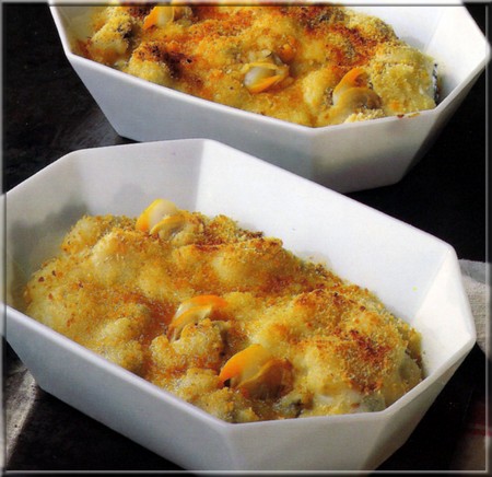 4- Mélanger coques et béchamel, repartir dans des moules à gratin individuels. Parsemer de chapelure. Déposer de noisettes de beurre.
