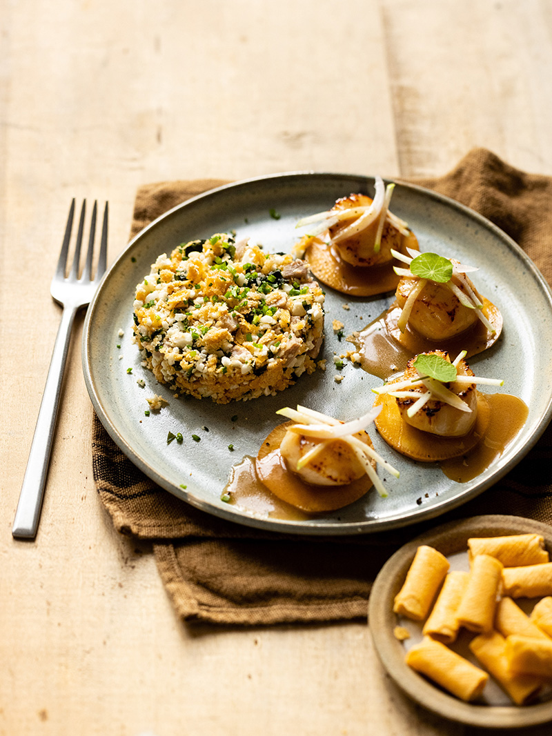 Coquille Saint-Jacques snackée, crumble de Crêpes Fourrées Crème et Oignon de Roscoff Gavottes®