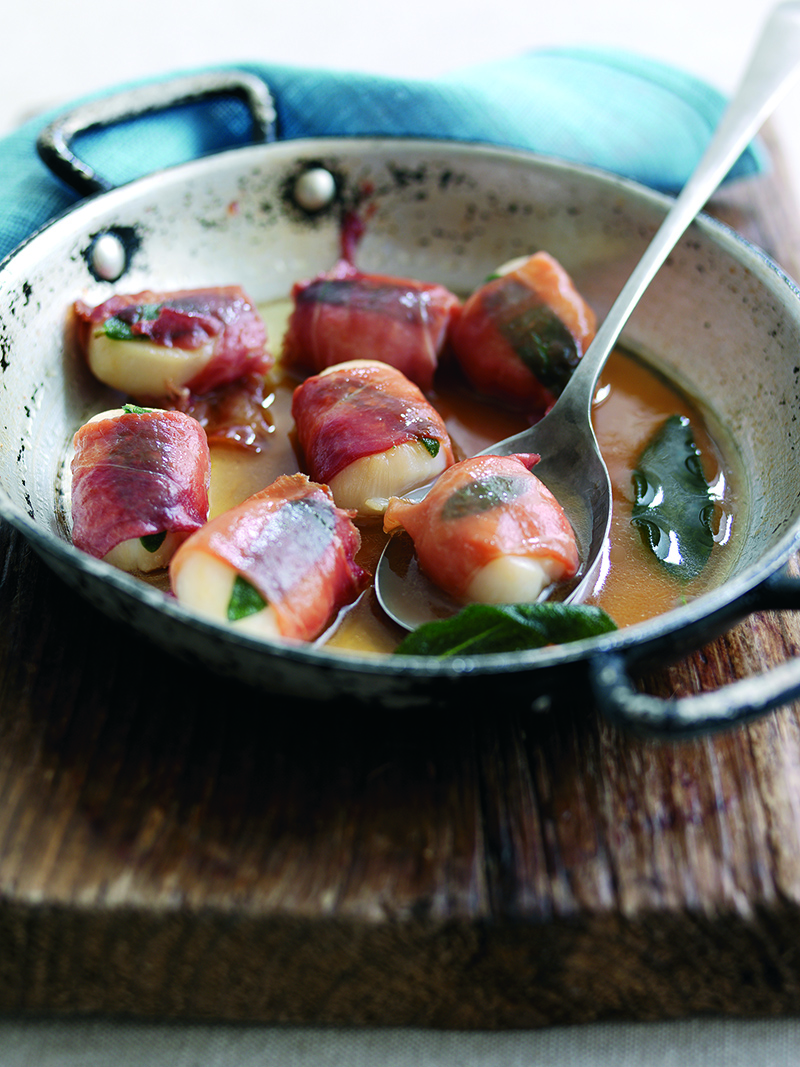 Coquilles Saint-Jacques enrobées de jambon de Parme et de sauge, sauce Marsala