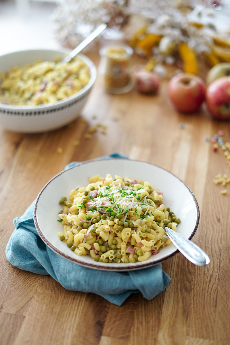 ⑦• Une fois que les coquillettes sont cuites, incorporez la crème, les petits pois, le jambon et poivrez. Mélangez délicatement.