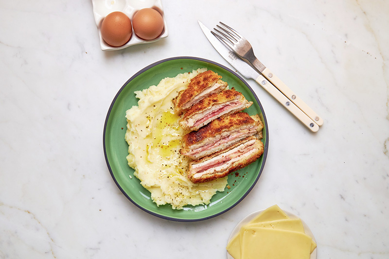 Un classique revisité pour régaler petits et grands : une viande tendre garnie de fromage fondant, de jambon et d’une touche croustillante, accompagnée d’une purée crémeuse et savoureuse préparée maison.