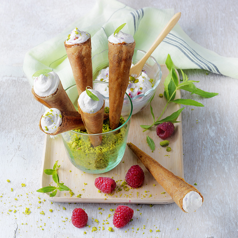③• Pour réaliser la crème, mélangez délicatement le St Môret®, le sucre, les framboises légèrement écrasées et les pistaches hachées. Déposez la préparation dans une poche à douille et fourrez les cornets avec la crème.