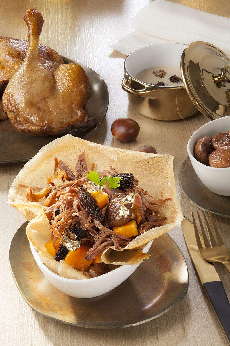 Corolles au Confit de canard effiloché, châtaignes, champignons et potimarron
