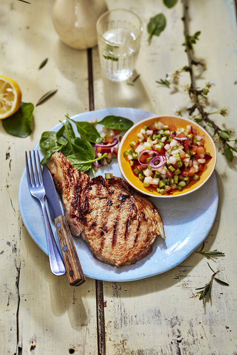 Côte de veau marinée au piment de Cayenne, brunoise de prunes, poire et céleri