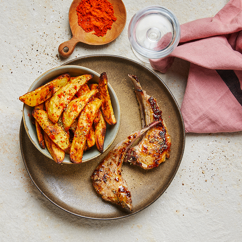Côtelettes d’agneau à la moutarde et au miel, frites maison au paprika