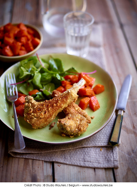 Servir les côtes d’agneau pannées aux noisettes accompagnées des dés de potiron.