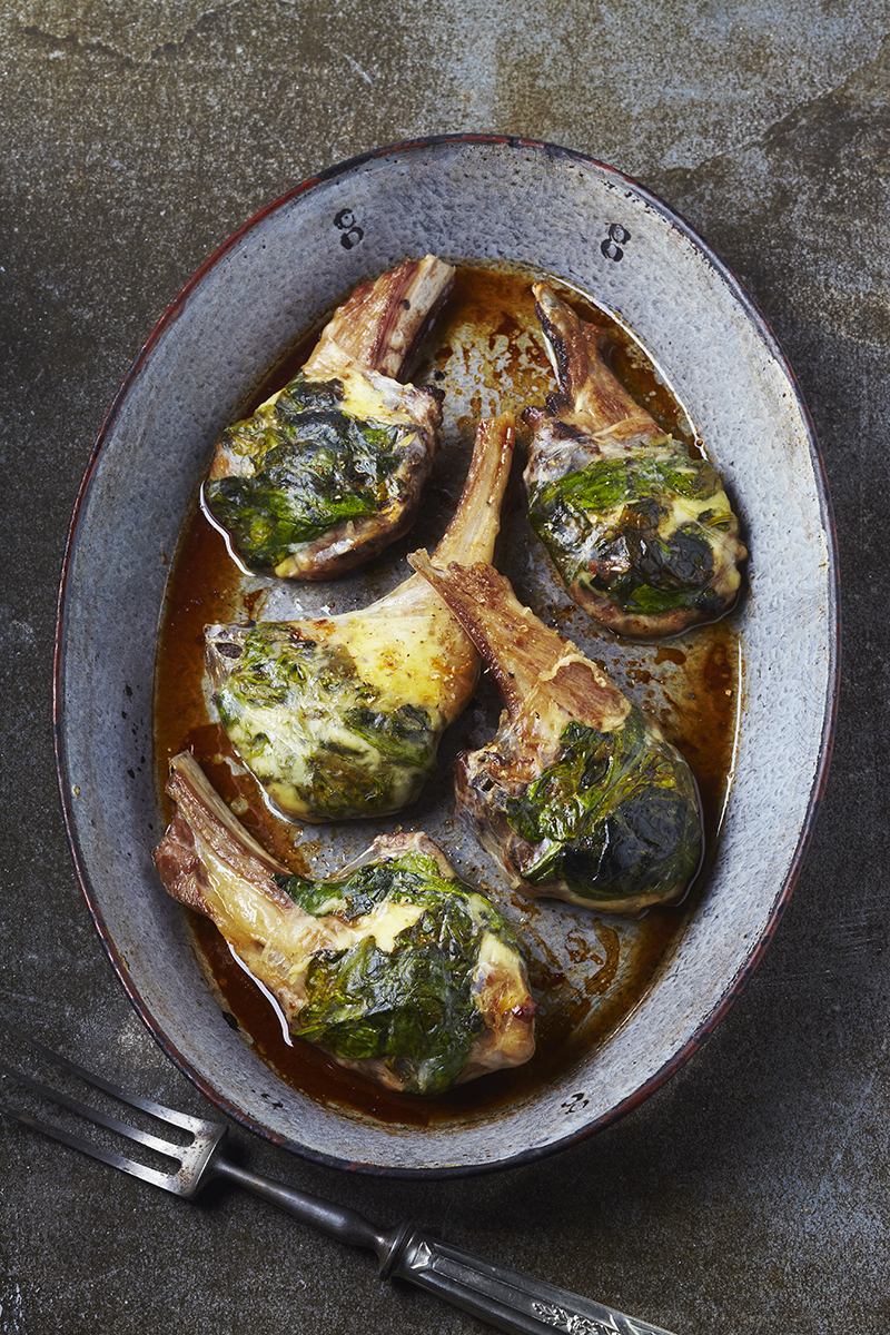 ④• Couper la crépine en 8 morceaux, tartiner généreusement les côtes d’agneau bio de farce aux blettes et les envelopper dans la crépine, les disposer dans un plat, les saler, les poivrer, les arroser d’un filet d’huile d’olive et les cuire 30 minutes au four.