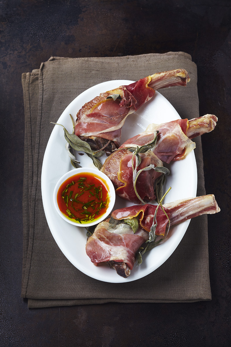 Côtes d’agneau en robe de jambon cru, sauce tomate à la sauge
