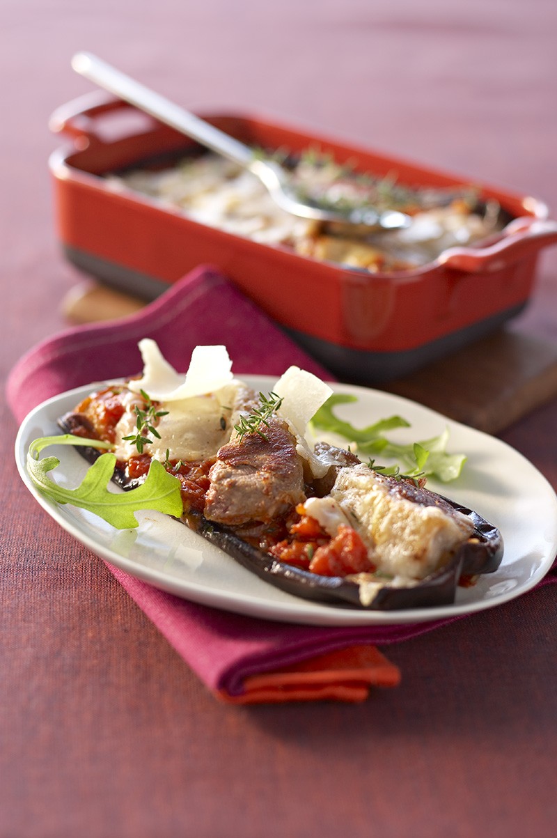 ⑤• Versez la moitié de la sauce tomate sur les aubergines, disposez les côtes d'agneau et recouvrez-les avec le reste de sauce.