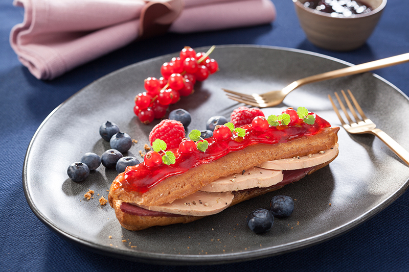Un éclair presque classique, avec une coque en pâte à chou, fourrée d’une compotée de fruits rouges, d’une tranche de Foie Gras Entier et de magret fumé. Le glaçage est aussi réalisé à partir de fruits-rouges.