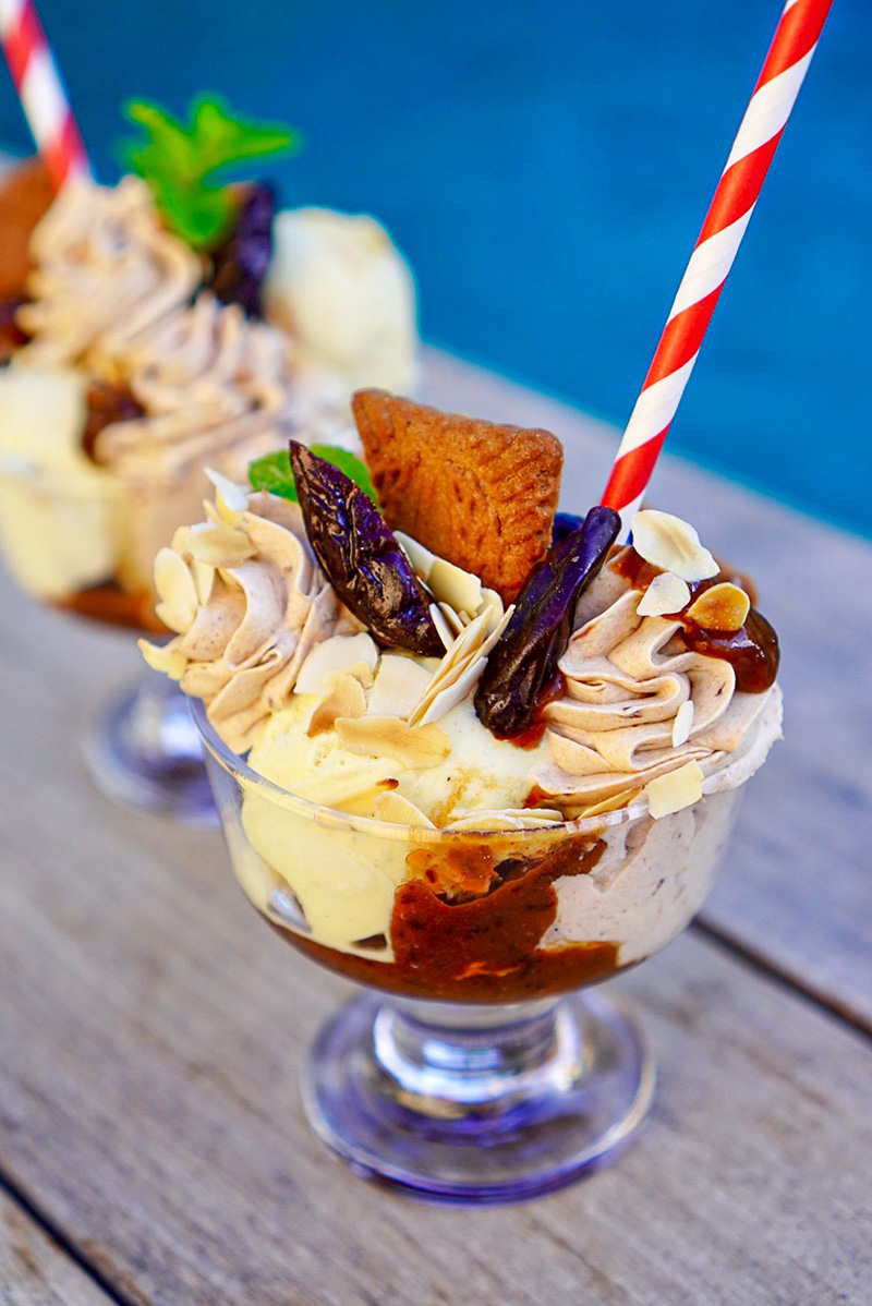 ④• Montez les coupes glacées avec du coulis dans le fond, des boules de glace vanille, spéculoos entiers ou en brisures, crème fouettée au pruneau et amandes grillées.