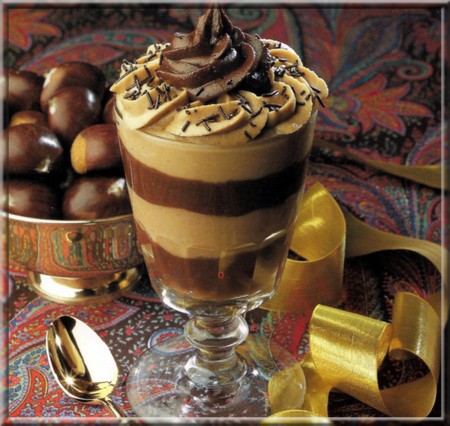 4.Remplir 6 coupes en alternant les couches.Réfrigérer 4 h.Décorer du mélange chocolat-purée (à la douille) et de vermicelles de chocolat.