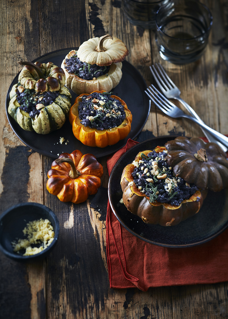 Courges farcies au risotto crémeux à l’encre de seiche, courge, Beaufort et aux noisettes