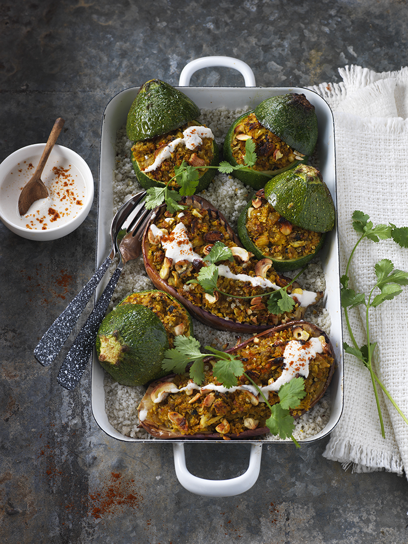 Courgettes et aubergines cuites au sel et farcies aux flocons de quinoa et “tahini” aux noix de cajou