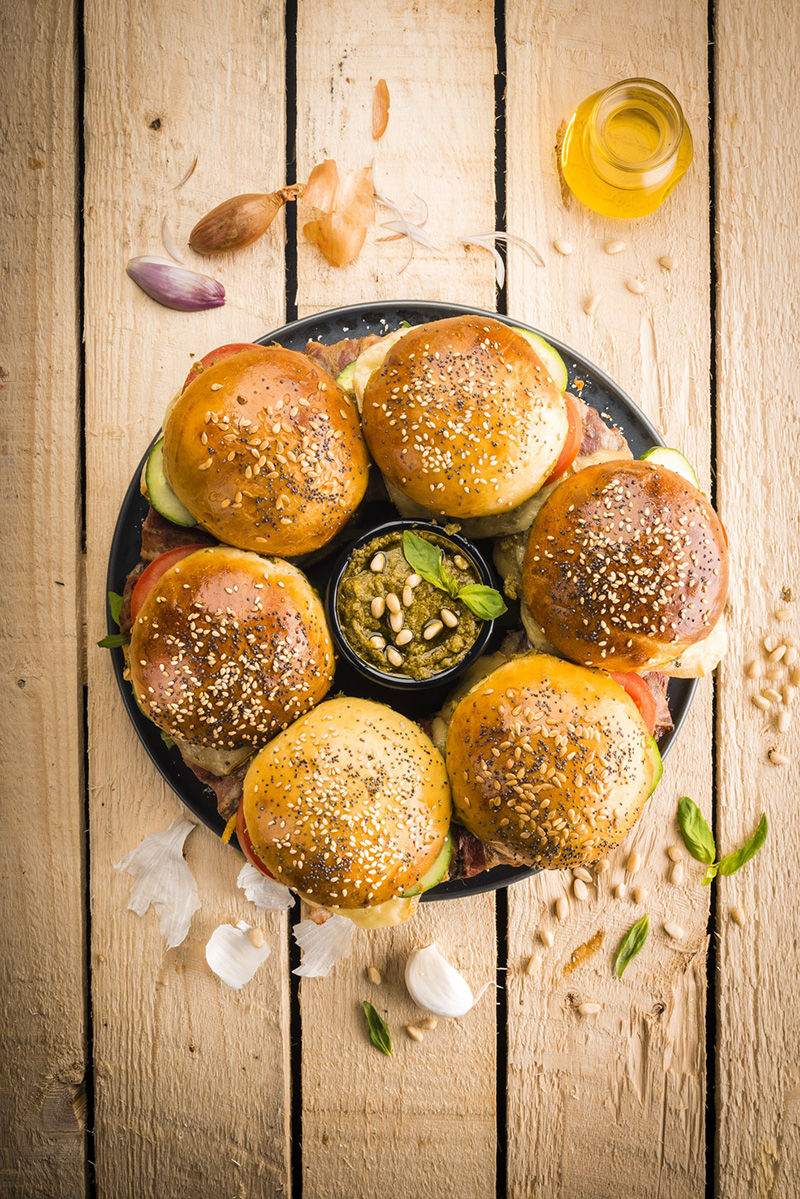 Disposez l’anneau de viande sur les pains burger, ajoutez les rondelles de concombre et de tomate puis refermez les burgers et servez avec un bol avec le restant de pesto au centre de la couronne de burgers !