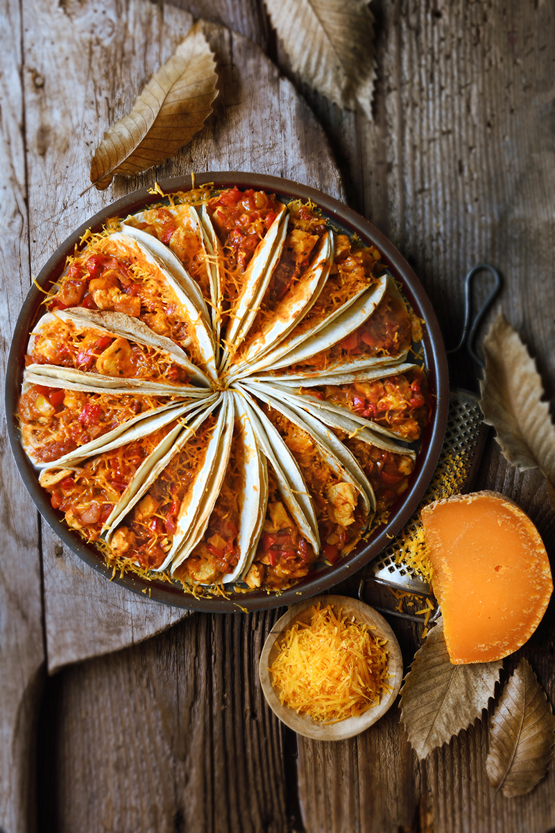 ⑥• Disposez-les tortillas en couronne et remplissez-les avec la préparation à l’aide d’une cuillère. Recouvrez chaque tortillas de mimolette râpée.