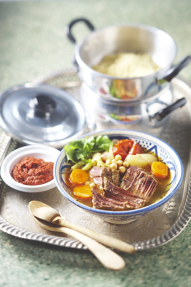 ⑧• Dresser la semoule dans un plat à part et servir la viande moelleuse et les légumes avec le bouillon accompagnée d’harissa.