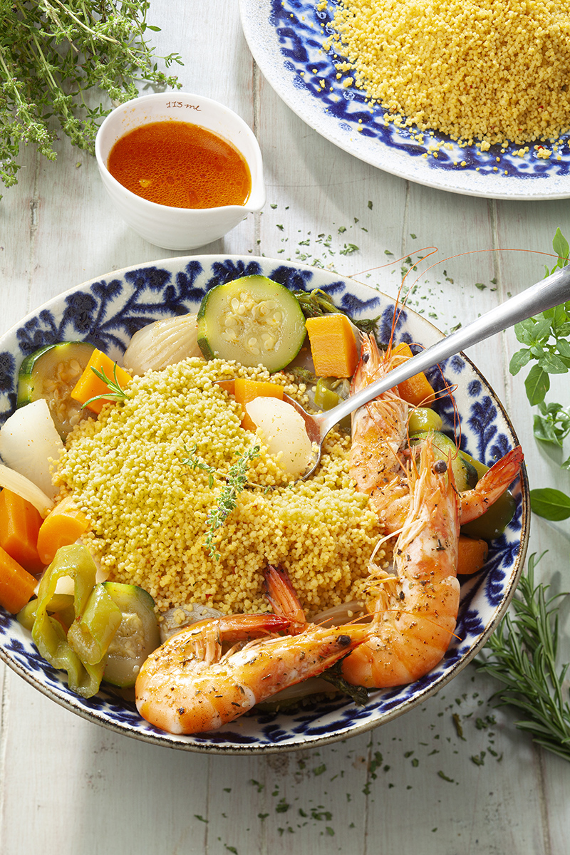 Couscous Parfumé aux Épices Douces, légumes & gambas sautées aux herbes
