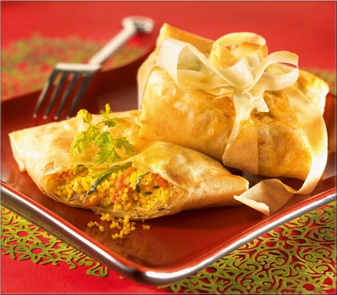 Découpez les feuilles de brick en 2 ou en 4 pour réalisez des mini pastillas que vous pourrez servir à l’apéritif.
