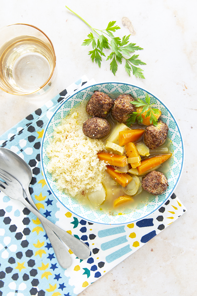 Servir la semoule bien chaude, accompagnée du bouillon, des légumes et des boulettes.