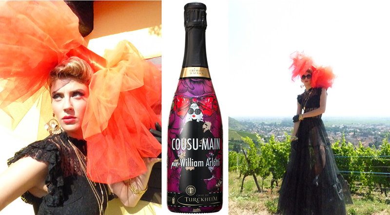 « Lorsque la Cave de Turckheim m’a confié le projet d’habiller et de signer une édition limitée pour leur nouveau crémant, j’ai pensé tout de suite à une Alsacienne un peu mutine, joyeuse, follement chic et un brin mystérieuse. Elle ne dévoile pas tout au premier regard…derrière ses lunettes noires et rondes, se cache un regard sensuel qui pourrait transformer le jour en soir ».