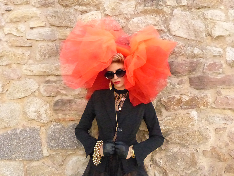 William Arlotti y dévoile une Alsacienne plus contemporaine en petite robe noire, lunettes noires portant une coiffe en tulle rouge revisitée par le styliste.