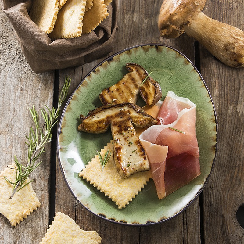 Crackers à la polenta, cèpes grillés et jambon de Parme
