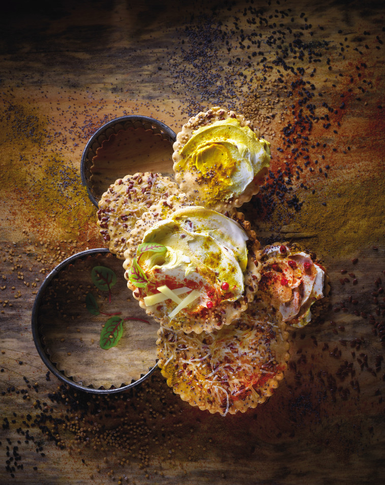 Étaler en vagues la Ricotta sur les sablés, saupoudrer d’épices, repasser un coup de spatule et décorer de Beaufort.