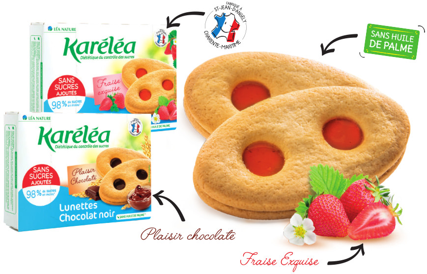 Alors on craque pour ces biscuits originaux et gourmands ! Le croustillant de ce biscuit au beurre est associé au fondant d’un fourrage au chocolat noir ou à la fraise, le tout avec 98% de sucres en moins que les produits classiques.