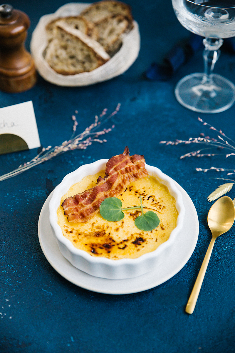 Crème brûlée au Pont L’Évêque, lard fumé et jeunes pousses d’épinard