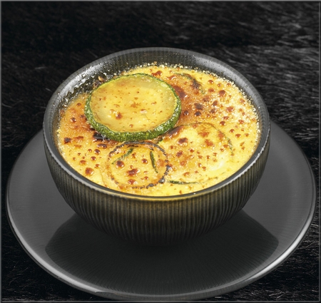 4• Dans un plat, mélanger les jaunes d’œufs, 20g de cassonade, la crème fleurette et le lait. Saler, poivrer. Ciseler le basilic et l’ajouter au mélange.