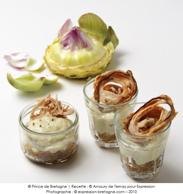 Crème d’artichaut, compotée d’échalote à l’hydromel, andouille de Guémené
